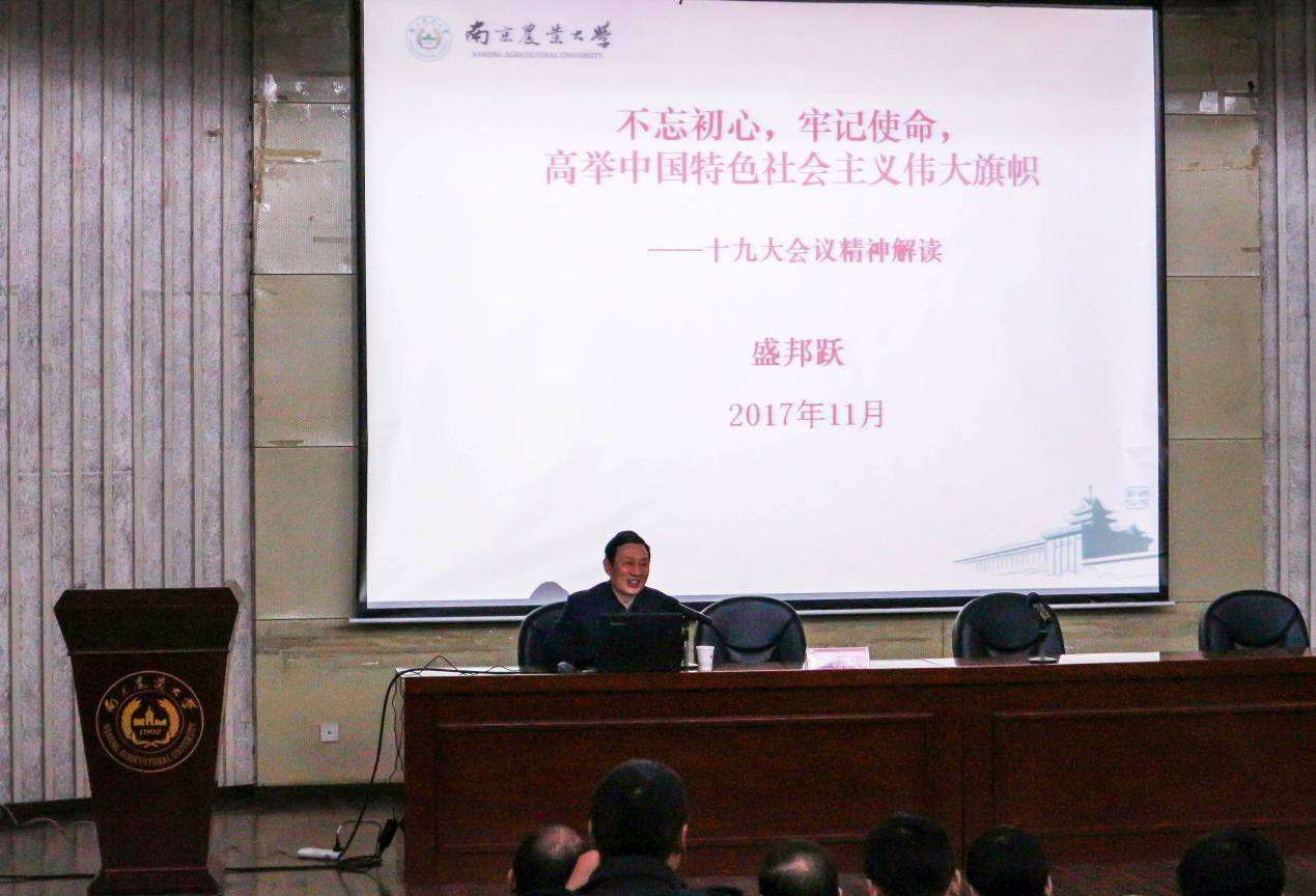 会长,盛邦跃围绕党的十九大“大会主题”、“时代定位”、“历史使命”、“四个伟大”、“八个明确”、“基本方略”、“重大意义”、“建设任务”八个方面为主要内容展开,对十九大报告中的背景知识、主要精神进行了重点解读,并与全体师生共同学习交流。