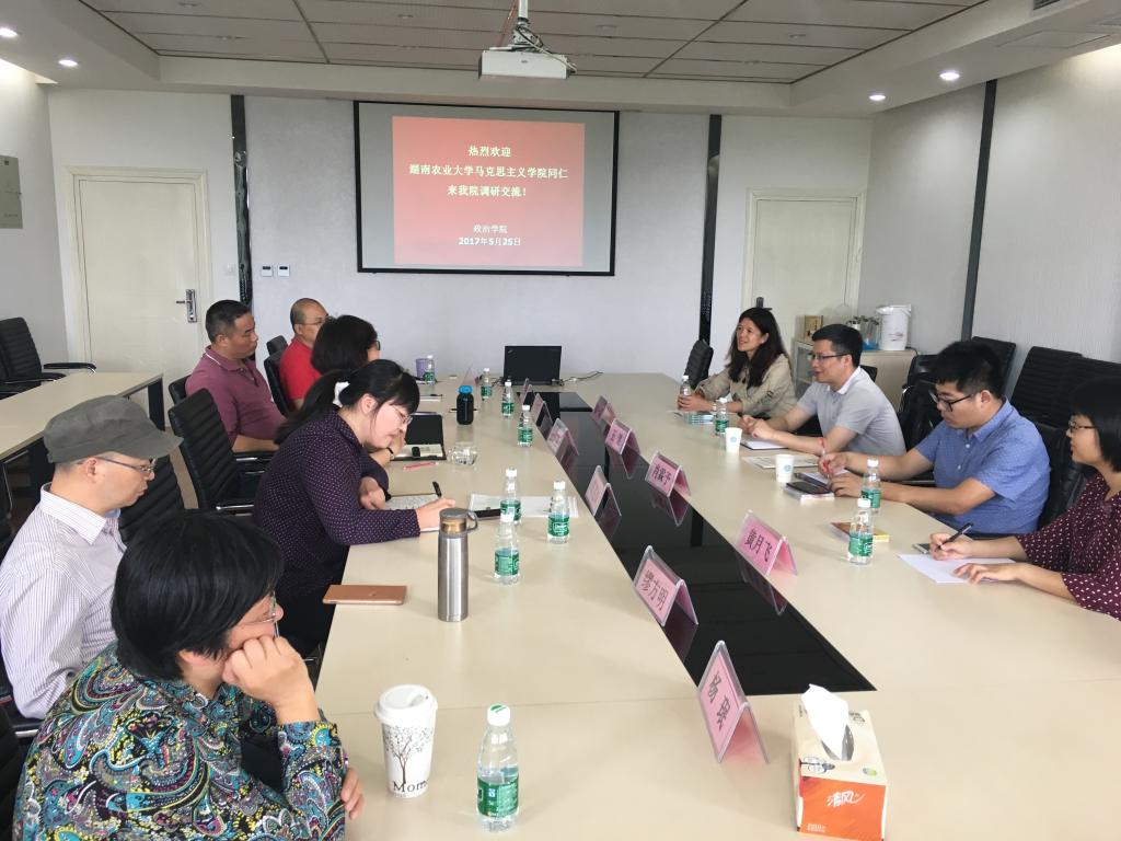 2017年5月25日,湖南农业大学a片成人 副院长王健一行4人来我校政治学院考察交流,政治学院院长、书记余林媛、副院长葛笑如以及道德与法、概论教研室主任、教师代表一同出席座谈交流。