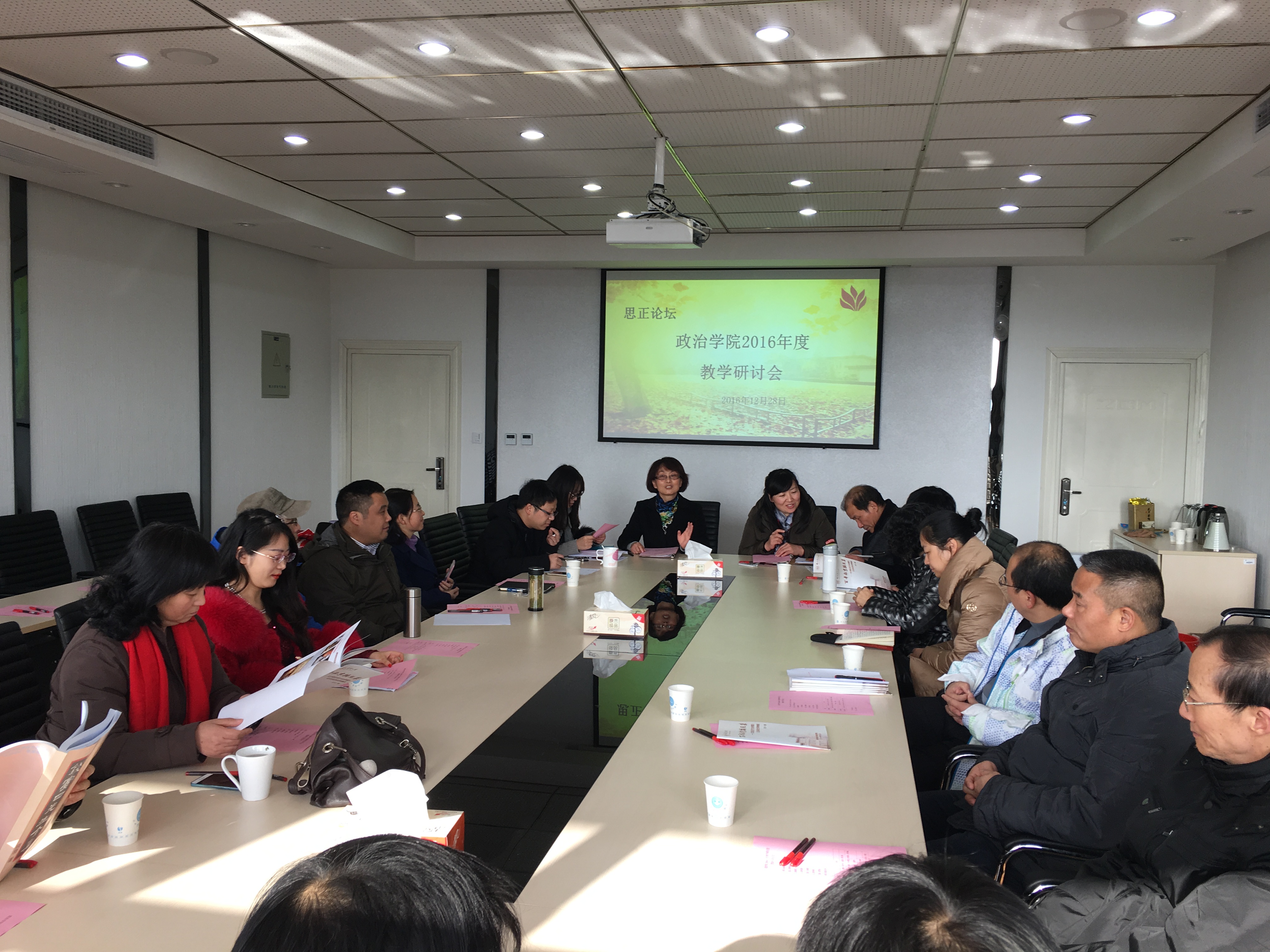 2016年12月28日下午2:00-5:00,政治学院在会议室A610举行2016年度教学研讨会,副院长葛笑如主持会议,院长、书记余林媛、学院全体教师参加了研讨会。