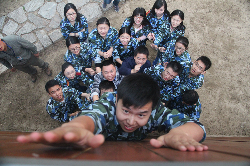 在教练引导下,研究生们进行了“破冰按摩操”、“不倒森林”、“鼓动人心”、“一圈到底”、“移动高尔夫”、“信任背摔”、“生死电网”、“驿站传书”、“毕业墙”等一系列团队活动。比如,“信任背摔”是在教练的帮助下,每位成员轮流站到1.5米左右高的背摔台上,其余成员中选出十位,五人一排,面对面互相顶住同侧膝盖,两手交叉平放在对方肩上。在听到背摔者说完“大家好!我是XXX,我来了!”之后,齐声应答:“我们永远支持你!”然后,背摔成员身体尽量保持平直向后倒下。这项看上去似乎寻常的活动,其本身却蕴含着人与人之间深度的相互信任,只有信任才可以无所畏惧地去完成这一系列动作。