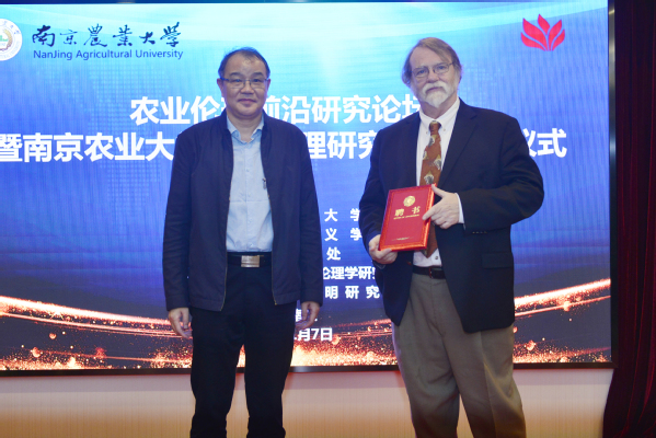 在与会人员的共同见证下,副校长丁艳锋和王思明教授共同为a片成人 农业伦理研究中心揭牌,并为专家学者颁发聘书。中心还特别聘请了在农业伦理学领域享有高层次盛誉的两位专家——王思明教授为中心名誉主任,PaulB.Thompson教授为中心学术委员会主任。
