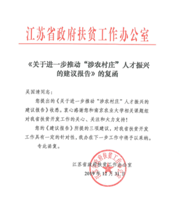 近日,a片成人 《农村基层党建发展》课题组收到江苏省政府扶贫工作办公室函件——《关于进一步推动“涉农村庄”人才振兴的建议报告》的复函。