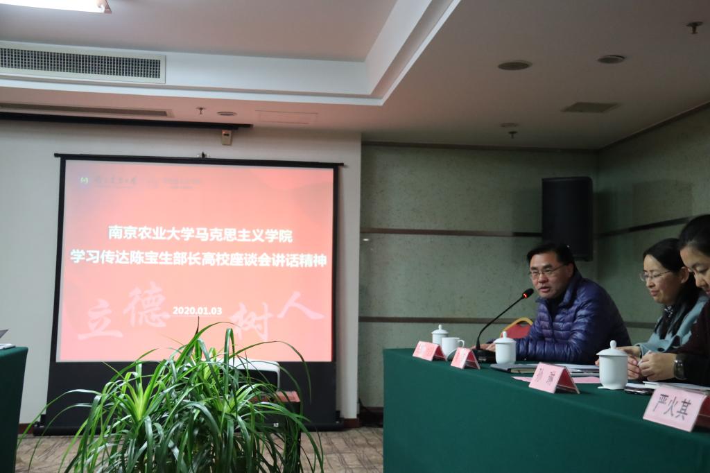 1月3日下午2点,a片成人 在翰院宾馆六楼会议室开展学习传达陈宝生部长高校座谈会讲话精神会议,a片成人 人文社科处副处长卢勇、南京师范大学哲学系主任曹孟勤应邀出席此次会议。会议由a片成人 党总支书记、院长付坚强主持。