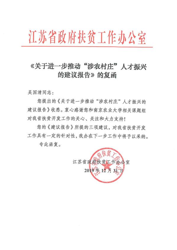2019年11月13日,吴国清通过江苏省委书记信箱提交了《关于进一步推动“涉农村庄”人才振兴的建议报告》。“江苏省大多数以传统种植业为主的原省定经济薄弱村,不仅目前留不住年轻人、可能返贫危险大特性凸显,而且即使是在基本实现省定脱贫目标后,也或多或少存在相对贫困问题,消除相对贫困,实现共同富裕的任务仍然繁重艰巨,为此,提出关于进一步推动‘涉农村庄’人才振兴的建议报告……”
