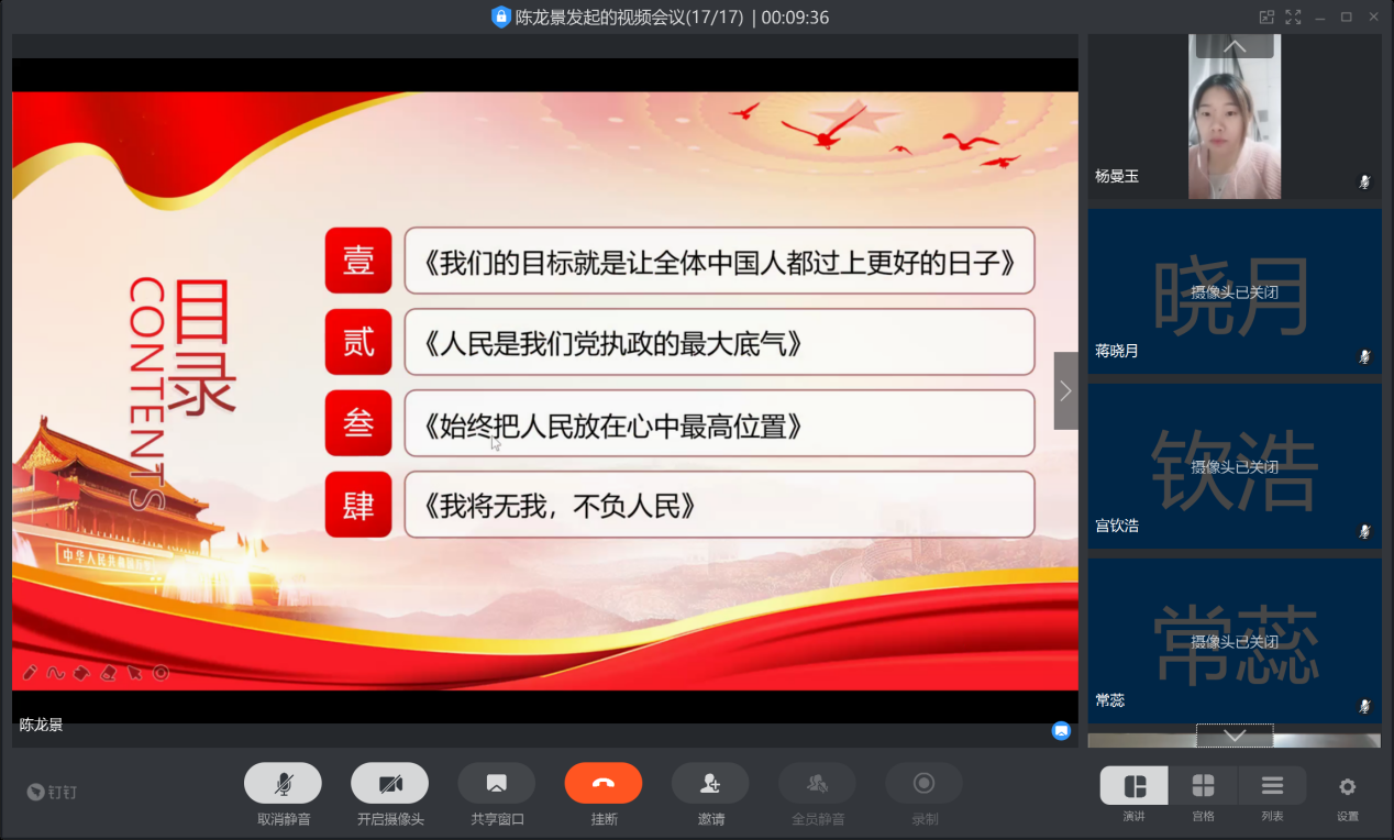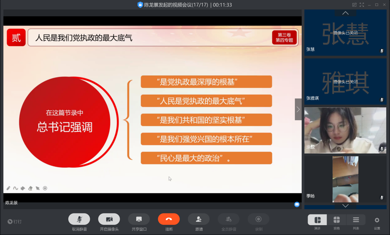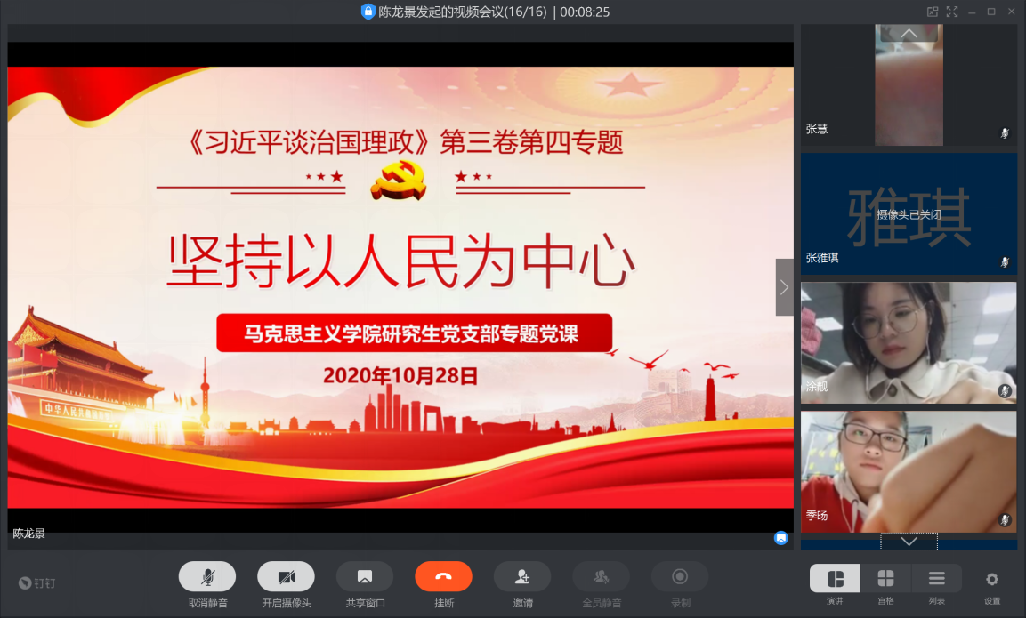 10月27日,a片成人 研究生党支部在线上召开专题党课。此次专题党课的主要内容是集体学习《习近平谈治国理政》第三卷第四专题。专题党课由支部书记陈龙景主持,研究生党支部全体党员参加了本次会议。