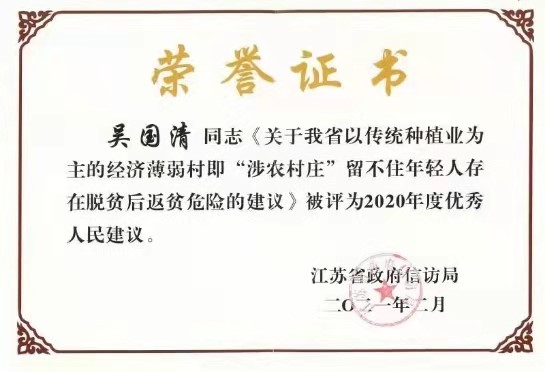 近日,a片成人 教授吴国清教授《关于我省以传统种植业为主的经济薄弱村即“涉农村庄”留不住年轻人存在脱贫后返贫危险的建议》被江苏省政府信访局评为“2020年度优秀人民建议”。