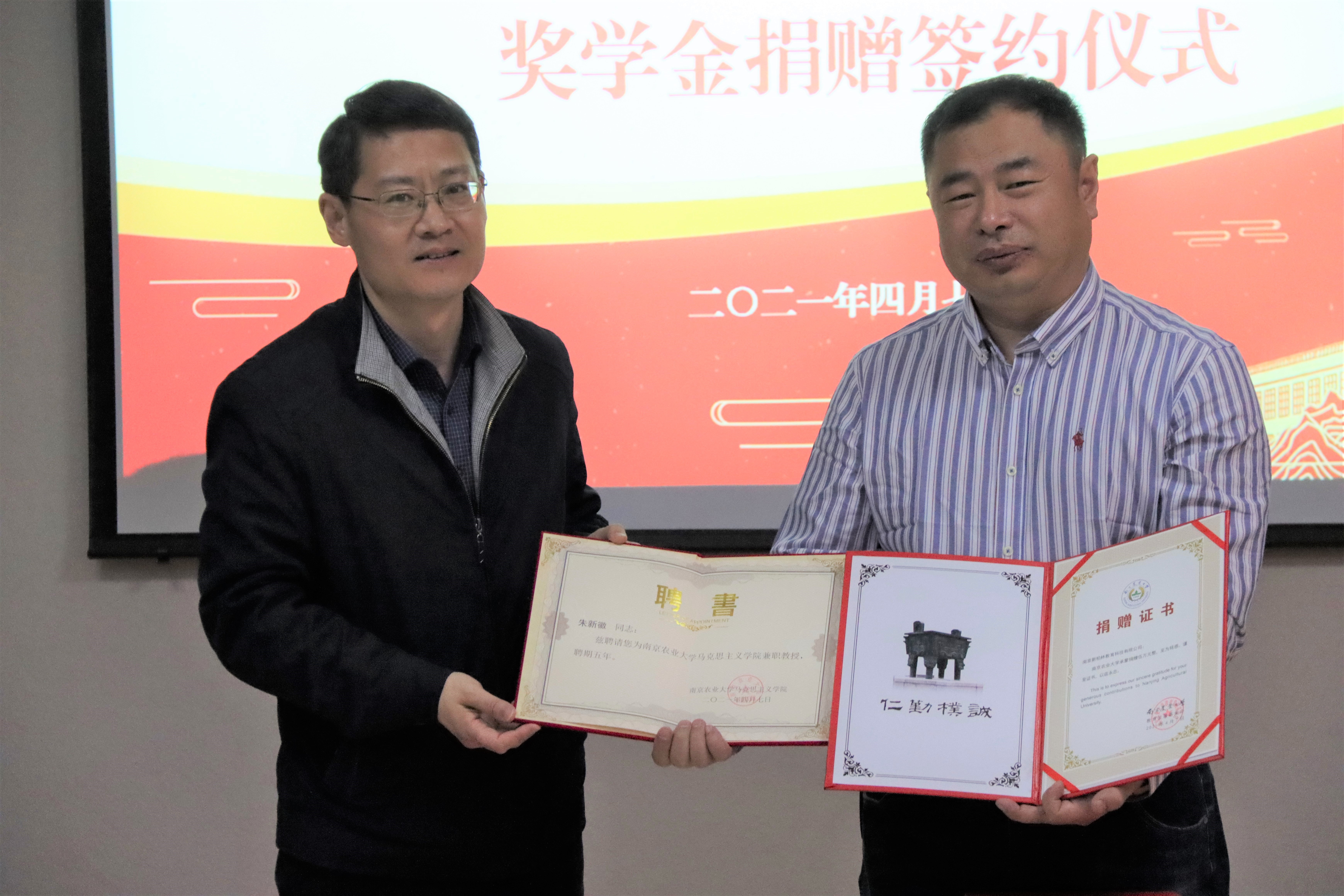 随后,陈卫忠与朱新徽签订捐赠协议,屈勇为朱新徽颁发捐赠证书和兼职教授聘书。