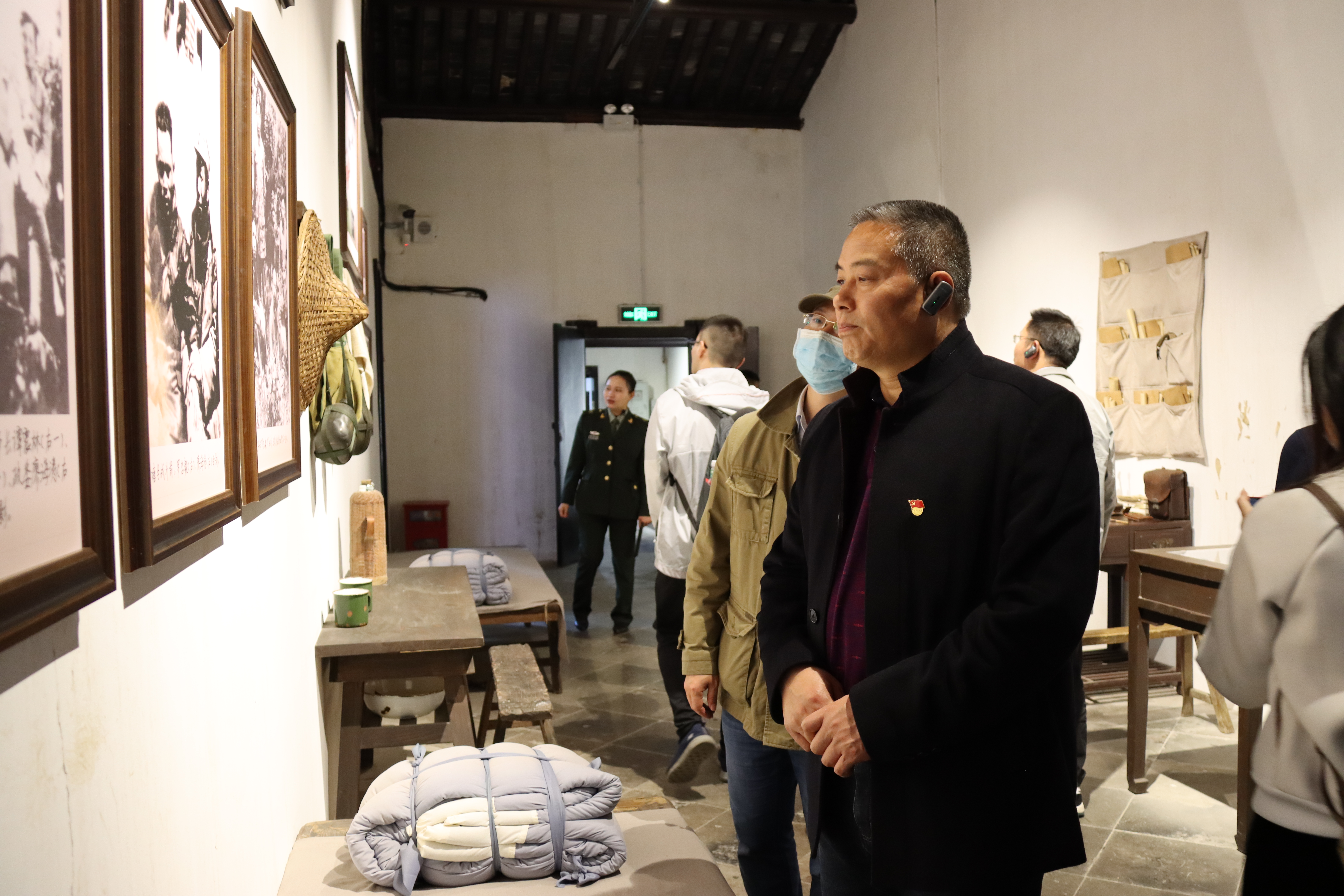 下午,一行人抵达位于溧阳市竹箦镇水西村的新四军江南指挥部纪念馆,踏上当年陈毅、粟裕等老一辈无产阶级革命家办公、住宿的土地,先后参观了新四军江南指挥部司令部、司令部副官处、政治部战地服务团、政治部印刷所等旧址。透过时空,党员们看到了那时水西村一草一木与日寇鏖战的烽火硝烟,感怀于新四军指战员与当地群众的鱼水情深,感动于陈毅将军与张茜同志的浪漫革命爱情,感念于水西村给中国革命带来的深远影响。同志们在一步一行中重温峥嵘岁月,缅怀革命先烈,接受思想洗礼,感悟“铁军”精神。