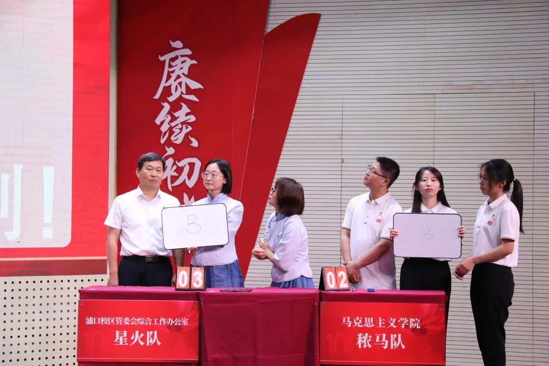 决赛由必答、抢答和展示三部分组成,形式多样,题型丰富,考察范围全面。必答题环节,马院参赛选手们发挥积极昂扬的团队协作精神拔得头筹;抢答环节,比赛进入白热化状态,选手聚精会神,勠力同心,将比赛过程一次次推向高潮。知识竞赛串联起中国共产党青春奋斗的记忆,展现马院师生深厚的党史知识积淀和“在马言马”奋勇前进的学院特色。