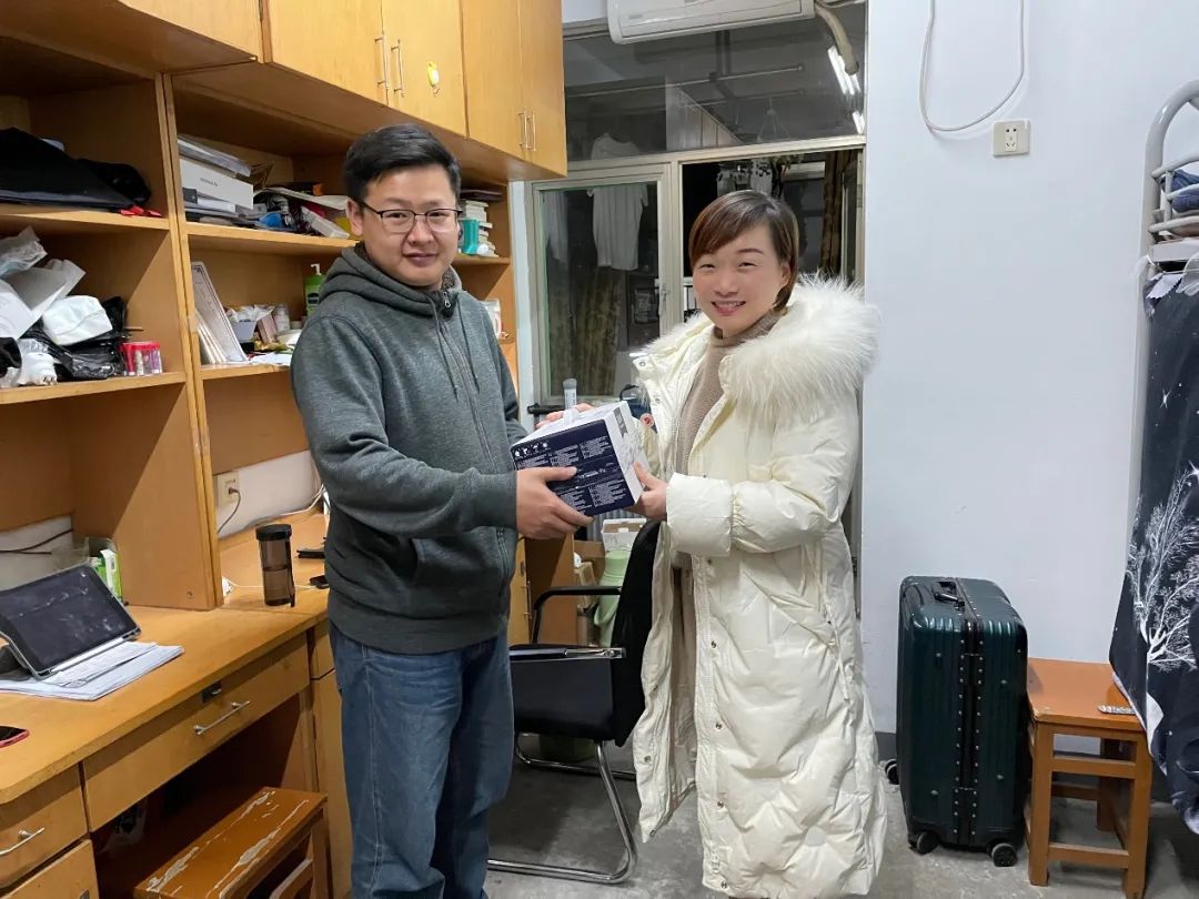 两位老师代表学院来到毕业生宿舍,将承载了学院深情和祝福的“牛奶礼包”送到毕业生手中,亲切地询问学生生活和学习情况、考公与考博进度安排,认真倾听其职业规划和就业困惑,并有针对性地提出指导意见与建议。