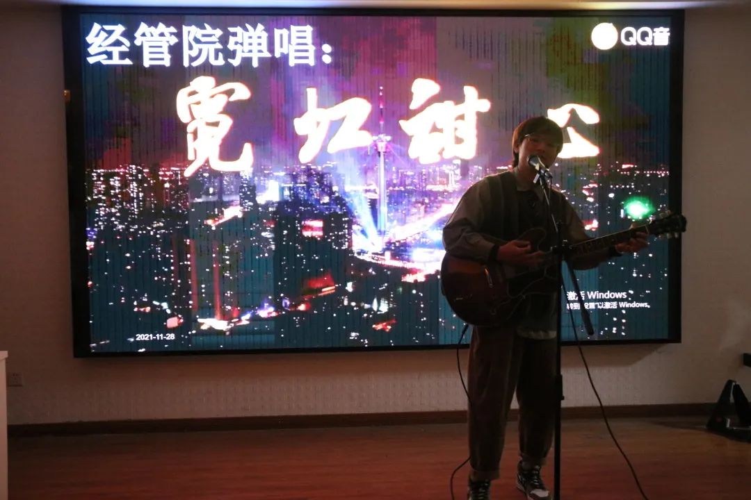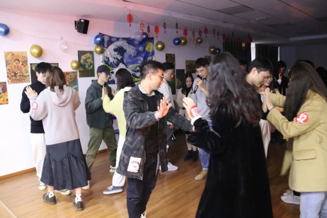 在集体舞环节,所有在场人员一起跟着藏族同学学习“锅庄舞”。在悠扬的民族音乐下,同学们围成圆圈载歌载舞,感受中华民族多元文化的同时,也拉近了彼此的距离。随后,由经济管理学院的同学为我们带来了弹唱表演《霓虹甜心》:一把吉他、一台键盘,变幻出一整支乐队。在他们音乐节奏的带领下,大家挥手互动,会场气氛更加热烈。